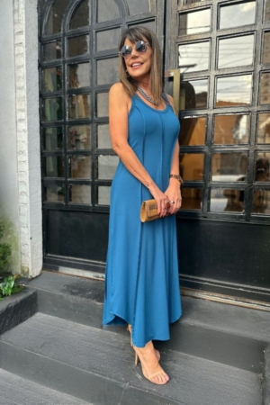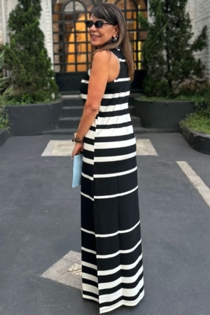 Vestido confeccionado em malha moletinho, decote redondo, modelo regata, fendas laterais e estampa em listras.
