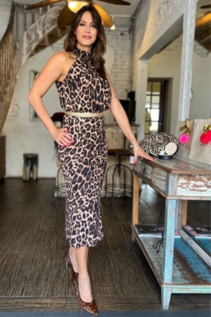Vestido confeccionado em crepe, modelo midi, decote decote high neck, recorte no decote traseiro, aplicação de elástico na cintura, animal print e fecamento traseiro por zíper e botão. Possui forro.