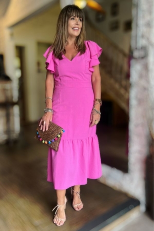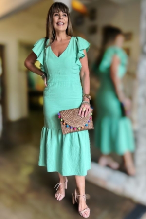 Vestido midi confeccionado em crepe de viscose, decote V, babado na saia e mangas e fechamento traseiro por zíper. Possui forro.