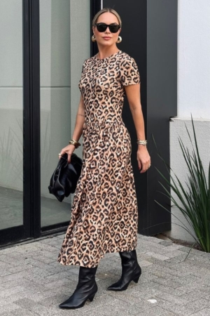 Vestido confeccionado em mix de materiais, top em malha canelada, decote redondo e mangas curtas, saia em tricoline, modelo evasê e estampa exclusiva da marca.