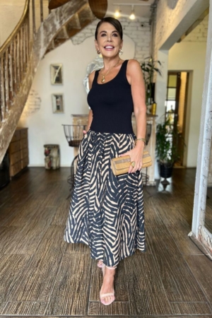 Vestido modelo midi, top confeccionado em malha de viscose, decote redondo, alças grossas, saia evasê confeccionada em viscose sarjada, bolsos laterais e estampa exclusiva.