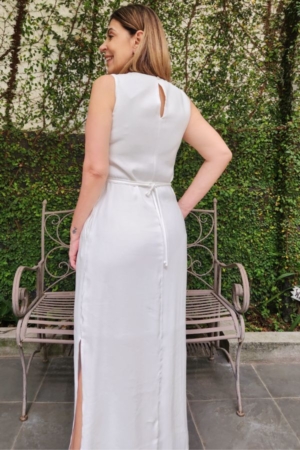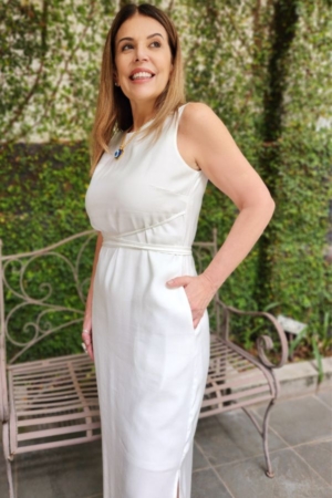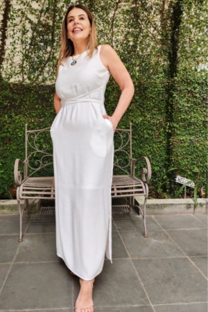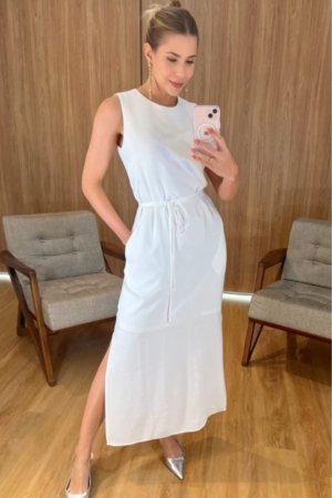 Vestido Midi Confeccionado Em Viscose, Bolsos E Fendas Laterais, Decote Redondo E Tiras Para Ajuste Na Cintura.
