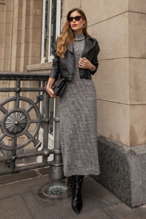 Vestido midi confeccionado em malha jacquard, gola alta, fenda traseira e fechamento traseiro por botão. Possui forro.