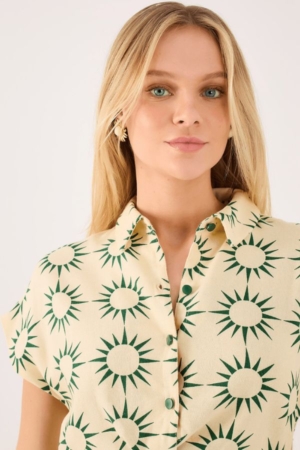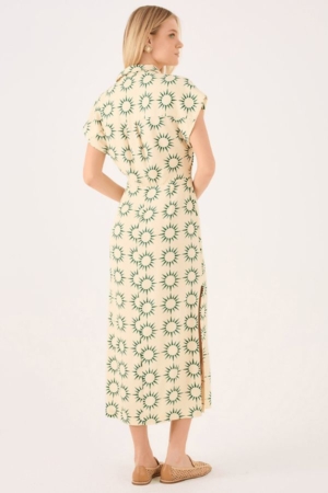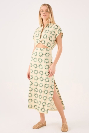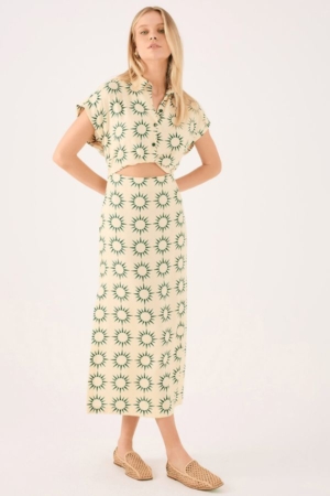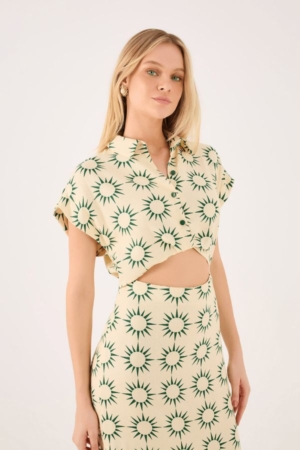 Vestido confeccionado em viscolinho, possui ombro deslocado, recorte vazado na cintura,fendas laterais, fechamento lateral por zíper e estampa exclusiva da marca.