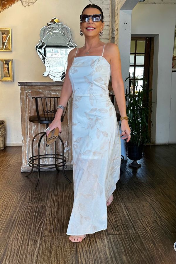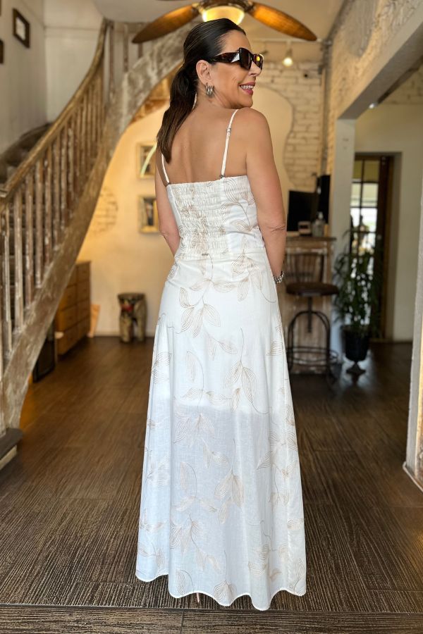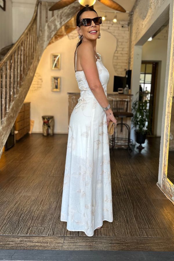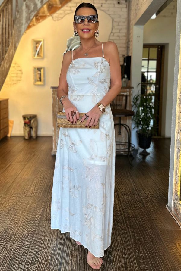 Vestido confeccionado em algodão misto, alças finas removiveis e com ajuste, aplicação de lastex nas costas, fechamento lateral por zíper e bordado exclusivo da marca.