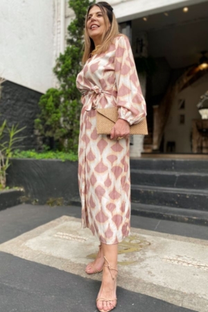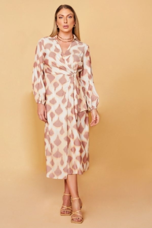Vestido Midi Confeccionado Em Viscose Mista, Modelo Transpassado, Gola Polo, Mangas Longas Com Aplicação De Elástico Nos Punhos E Estampa Exclusiva Da Marca.