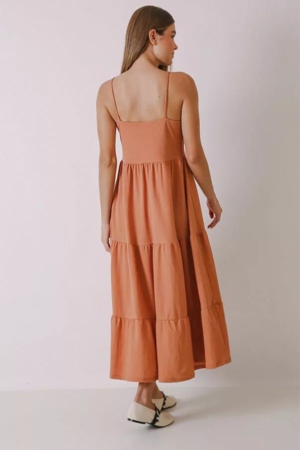 Vestido midi confeccionado em viscose sarjada, decote quadrado, alças finas e saia três marias.