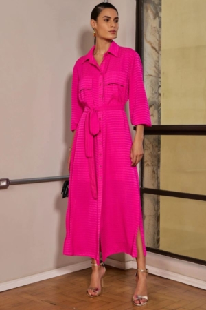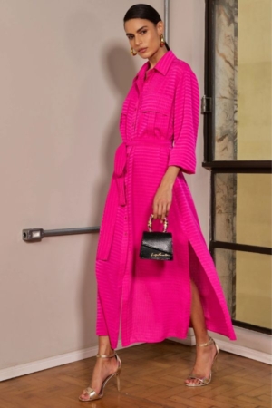 Vestido Confeccionado Em Crepe De Chiffon, Comprimento Midi, Gola Lapela, Bolsos E Fechamento Dianteiro Por Botões. Acompanha Vestido Combinação.