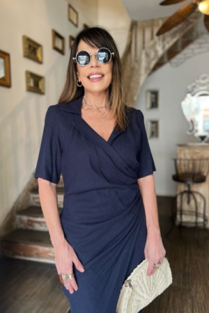 Vestido Midi Confeccionado Em Linho Misto, Decote Transpassado Com Gola Lapela, Detalhe Drapeado Na Lateral E Fechamento Lateral Por Zíper.