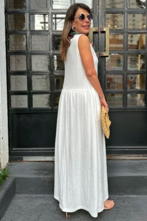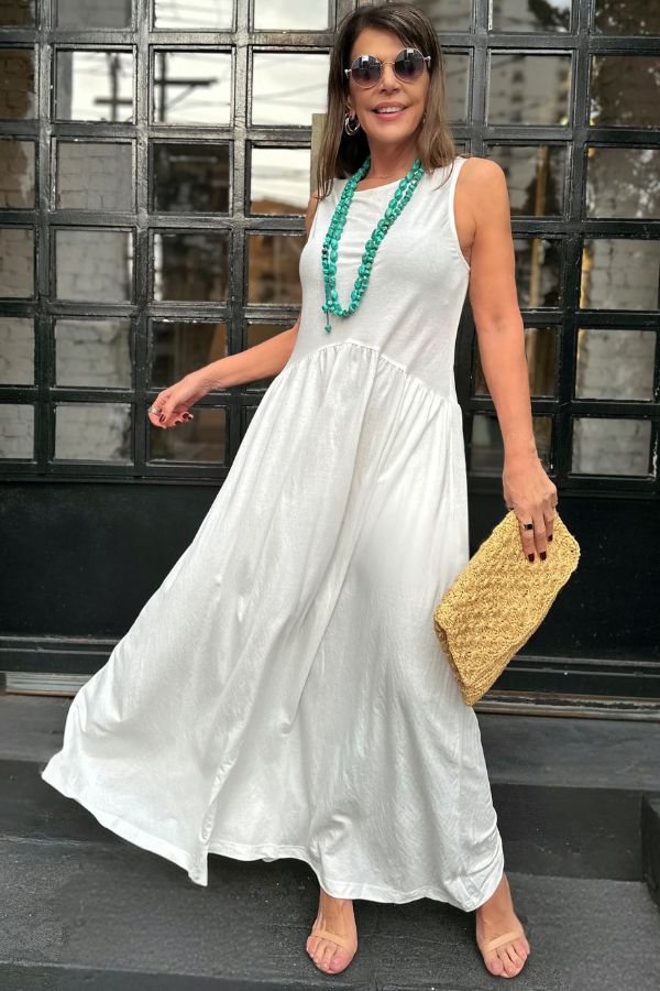 Vestido confeccionado em viscose mista, modelo midi, decote redondo, saia franzida e bolsos laterais. Possui forro.