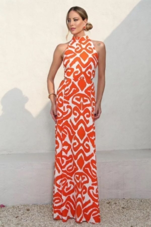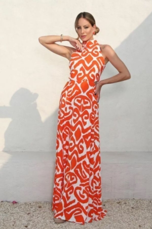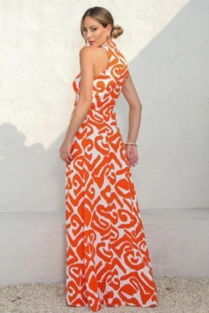Vestido confeccionado em viscose, decote high neck, recortes vazados na cintura, fechamento traseiro por zíper e estampa exclusiva. Possui forro.