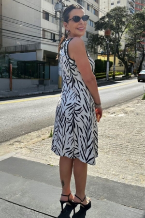 Vestido confeccionado em viscose sarjada, modelo em A, decote redondo, bolsos laterais, acabamentos em vivos e estampa exclusiva da marca.